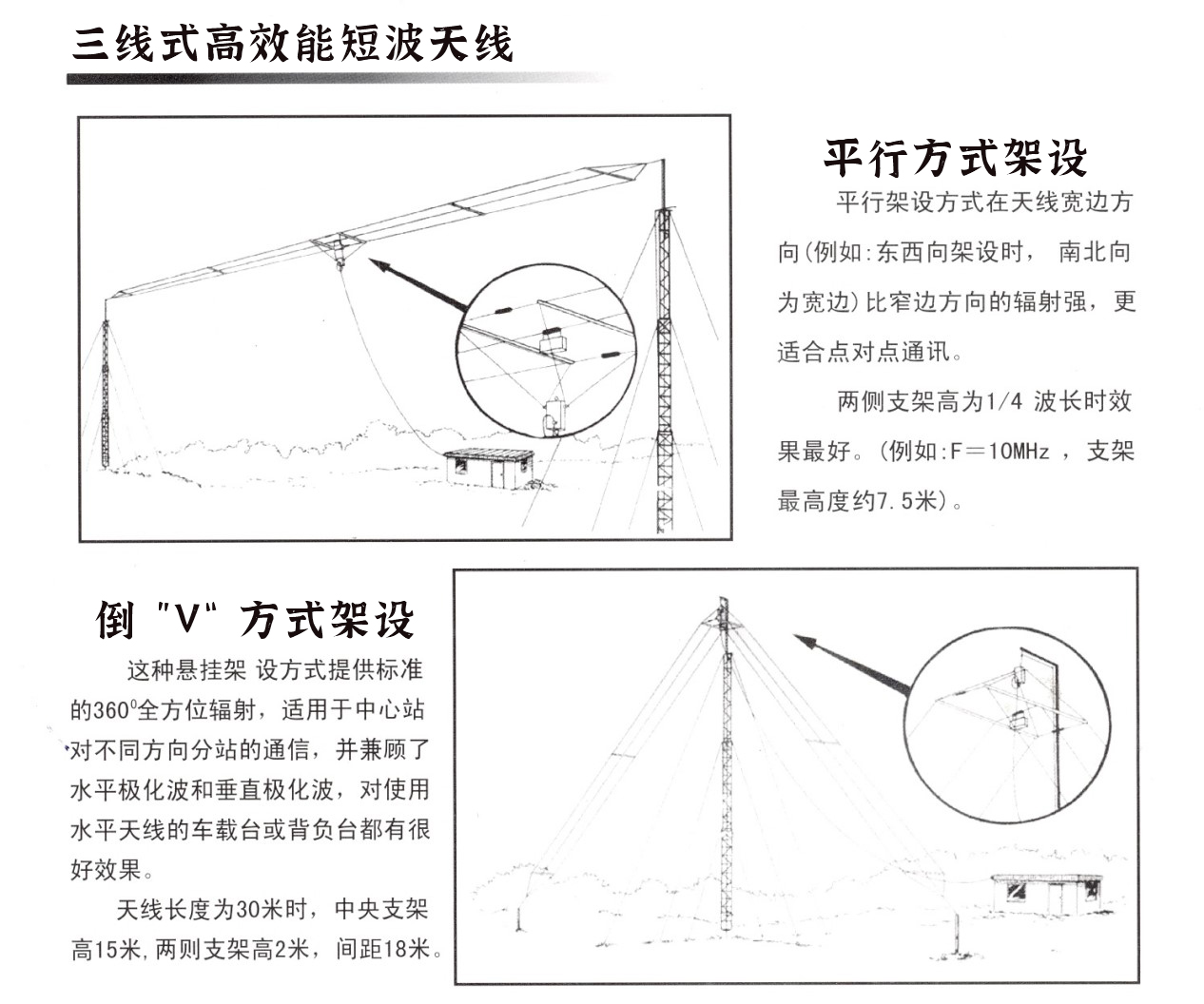 短波寬帶三線式天線有平行方式架設(shè)和倒“V”兩種規(guī)范架設(shè)方式,分別適應(yīng)于遠(yuǎn)距離定向通信和全向中等(近視500Km)左右距離通信。下面是一般架設(shè)要求,實際應(yīng)用中根據(jù)工作頻率可能會有更佳通訊高度和方向需要調(diào)整和試驗。