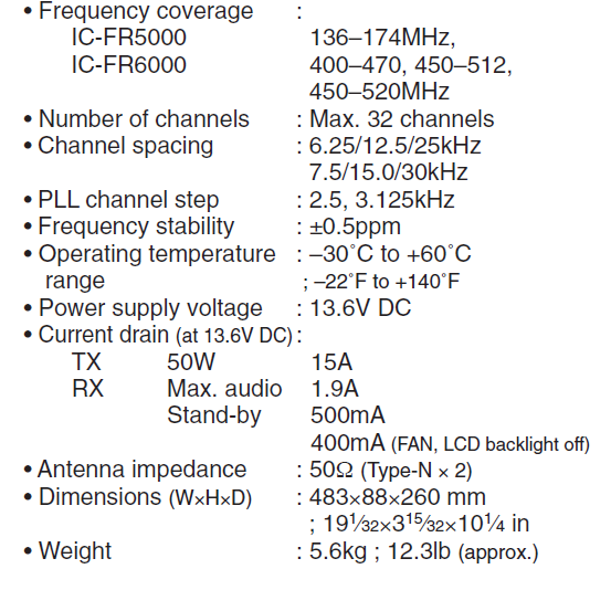 ICOMFR5000/6000數模兩用中繼臺(中轉臺)外觀和技術參數如下