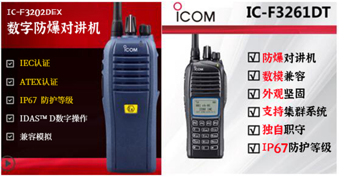 目前在售的ICOM對(duì)講機(jī)防爆主要美國(guó)和歐洲認(rèn)證標(biāo)準(zhǔn)的可轉(zhuǎn)換成中國(guó)相應(yīng)標(biāo)準(zhǔn)的防爆對(duì)講機(jī),常見品牌如早期的IC-F51/61防爆防水對(duì)講機(jī),IC-F3161/4161DT,IC-F3261/4261DT防爆對(duì)講機(jī)和IC-F3202DEX/4202DEX氫氣防爆對(duì)講機(jī)。它們都是已經(jīng)在防爆行業(yè)應(yīng)用多年的防爆對(duì)講機(jī)品種,值得用戶信賴和推薦。