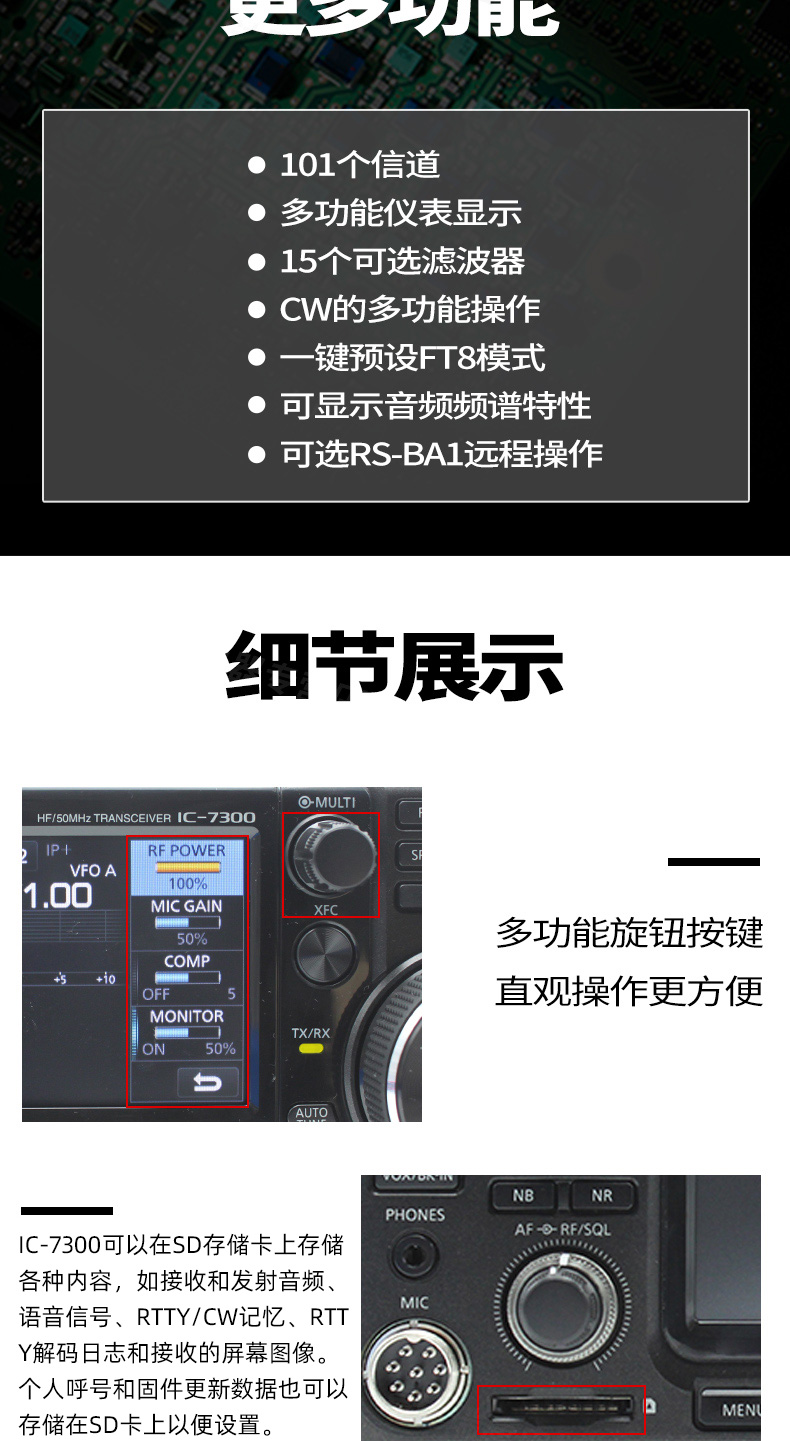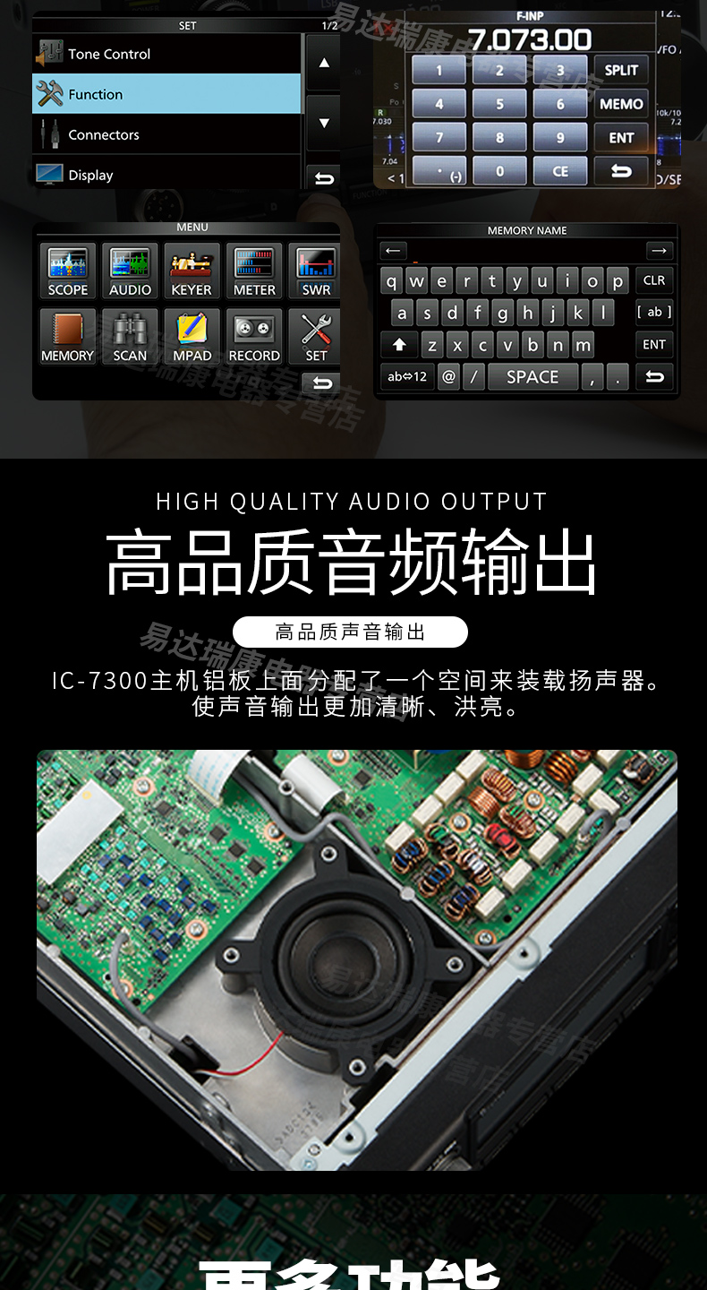 IC-7300提供高品質(zhì)音頻輸出,IC-7300專門在主機(jī)鋁板上面,分配了一個(gè)空間來裝載揚(yáng)聲器。是聲音輸出成為一個(gè)獨(dú)立單元。
