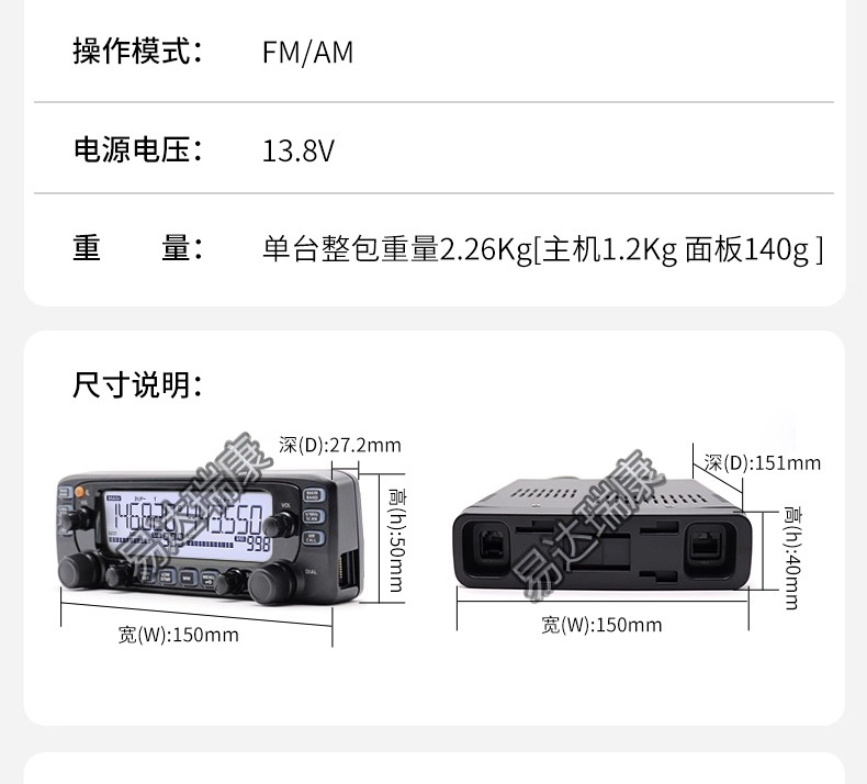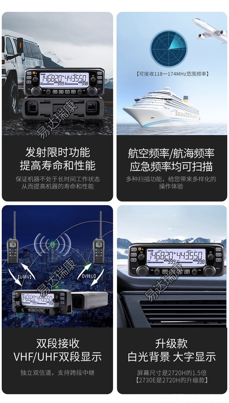 可接收航空段頻率,144MHz/430MHz雙段發(fā)射雙顯雙待業(yè)余車載電臺(tái),可選配藍(lán)牙功能,清晰白色背光LCD大屏,控制面板與主機(jī)可分離,輸出功率50W。 核準(zhǔn)代碼CMIIT ID: 2015FP1145