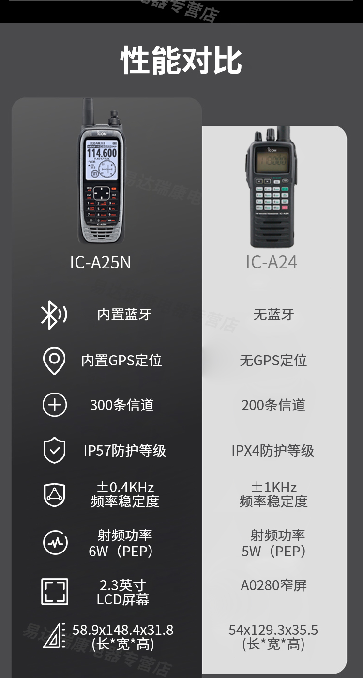 IC-A25N內(nèi)置GPS和藍(lán)牙,VOR導(dǎo)航功能可以幫助您修正航線,以免出現(xiàn)偏差。 IC-A25N/A25C航空對講機有2.3英寸液晶顯示屏,智能電量顯示可實時檢測電池狀態(tài),IP57防護(hù)等級防止灰塵進(jìn)入,1米水下放置30分鐘核準(zhǔn)代碼:CMIIT ID:2018HJ0692