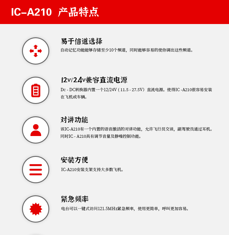 航空頻段通信臺具有雙頻率窄面板顯示,配件全可移動固定插入安裝方式,白光字符顯示,自動靜噪,12V/24V DC供電,內置對講功能側音功能。