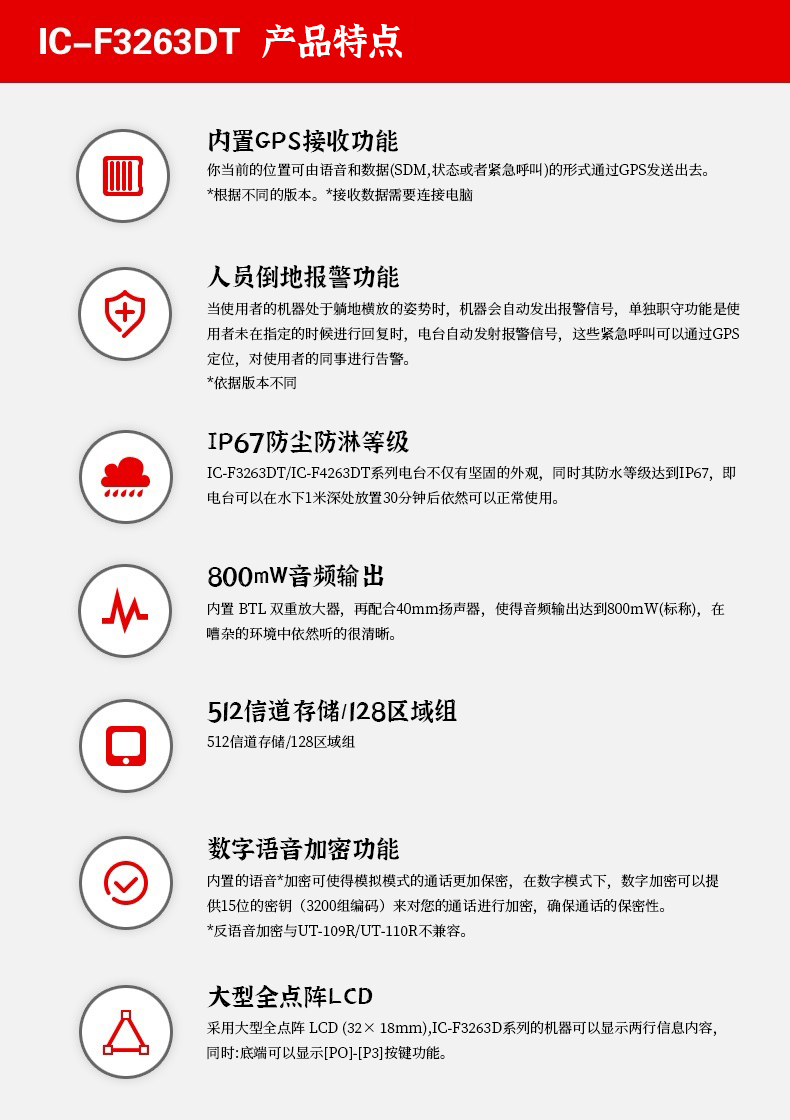 數模兼容,內置GPS,兼容NXDN,IP67防護等級,水深1米放置30分鐘不影響設備性能。人員倒地報功能。語音數字加密,保障通話私密性。