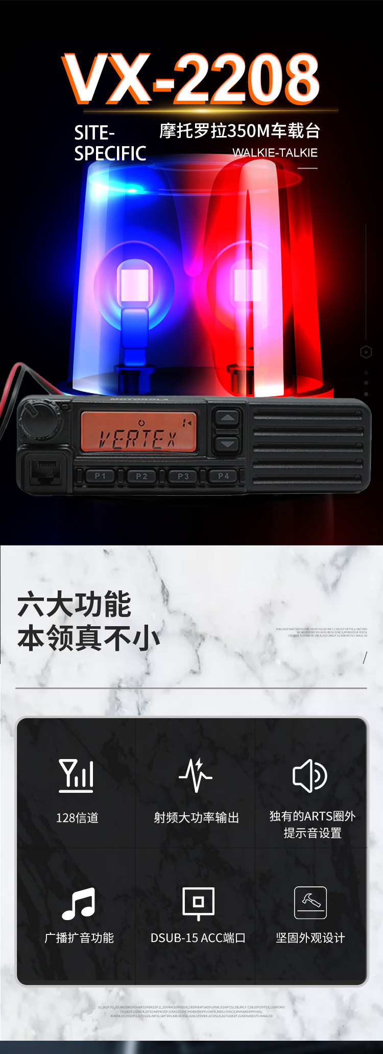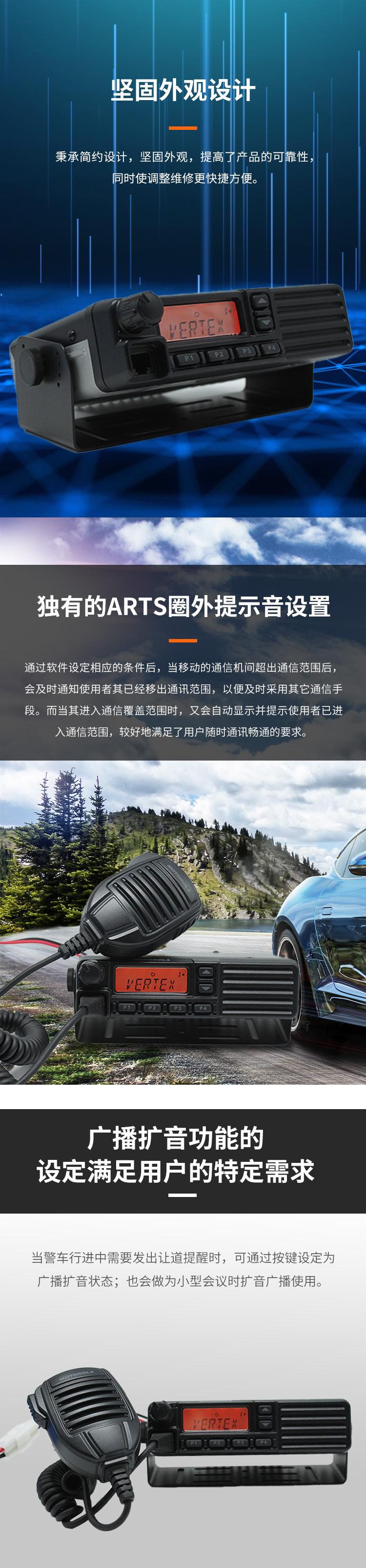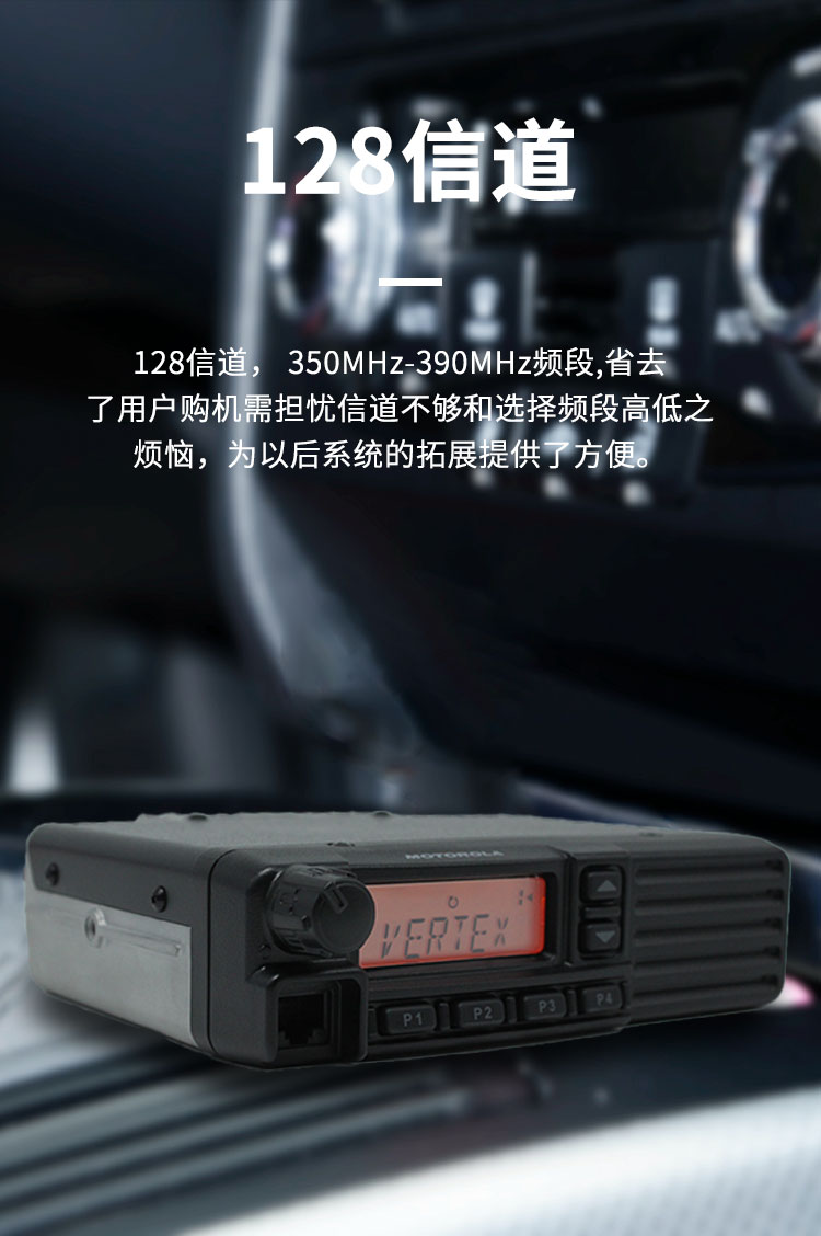 128個信道,25W高功率輸出,寬頻帶350-390MHz,遠程停用、啟用功能。緊急報ARTS圈外提示功能,超出通訊范圍會發出提示,語音加密功能(可選)。