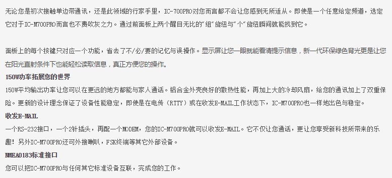 您當(dāng)前的位置: 首頁(yè) > 產(chǎn)品中心 > ICOM艾可慕IC-M700PRO海事短波