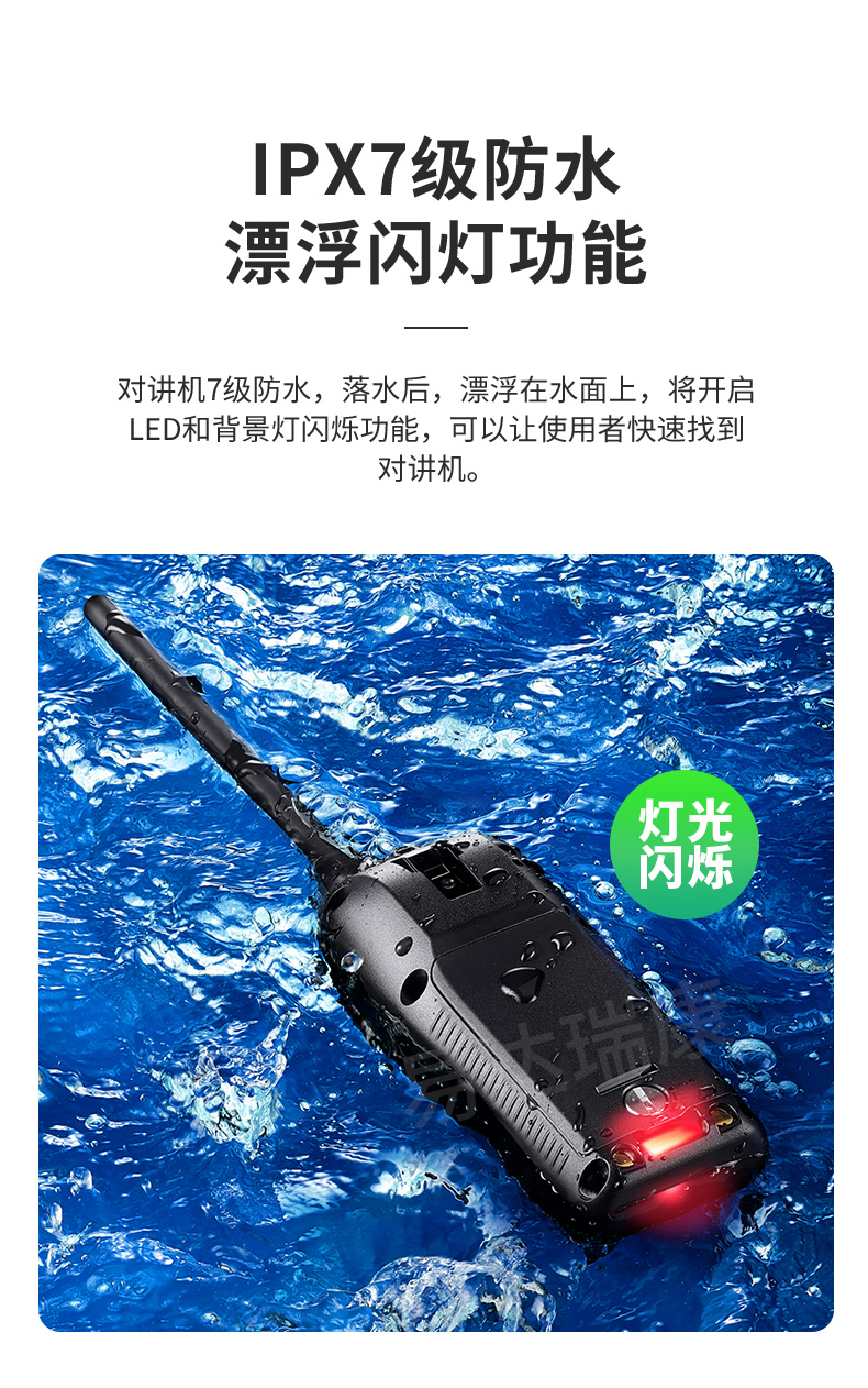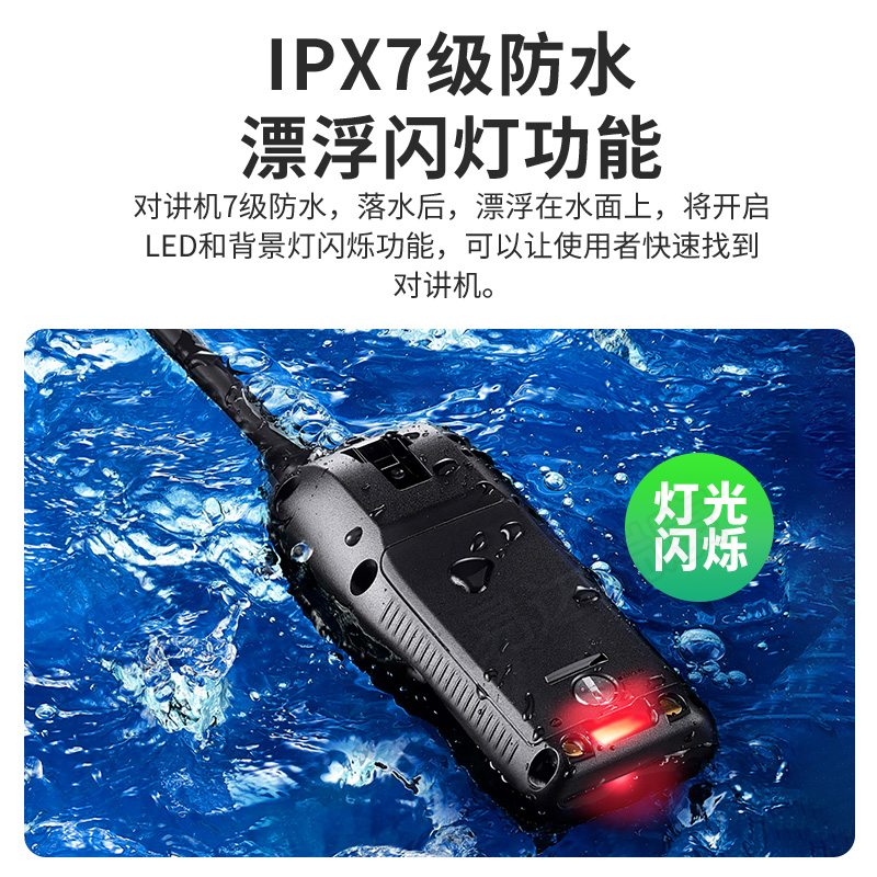 對(duì)講機(jī)可以漂浮在水面上,同時(shí)閃爍的LED燈,幫助您從水中取回它。