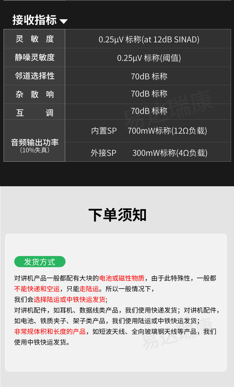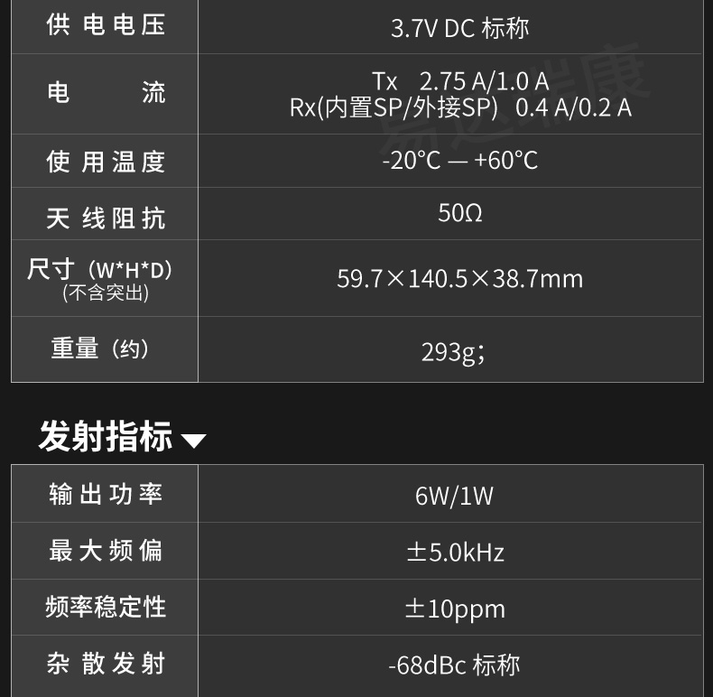 IPX7級(jí)防水設(shè)計(jì),按鍵大,握感好,手感舒適,方便操作,使用稱(chēng)心, 6 W大功率射頻輸出,傳輸更遠(yuǎn),更安心可靠, 700 mW音頻輸出