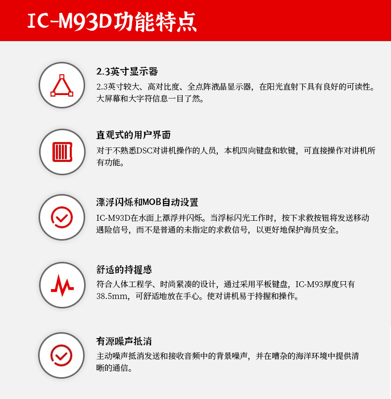 2.3英寸顯示器,操作一目了然 漂浮設(shè)計(jì),掉到水里也可以輕松撈起 直觀式的用戶界面,操作更簡(jiǎn)單。 內(nèi)置DSC,帶CH70接收 內(nèi)置人員掉水功能。 內(nèi)置綜合全球衛(wèi)星導(dǎo)航系統(tǒng)GNSS接收