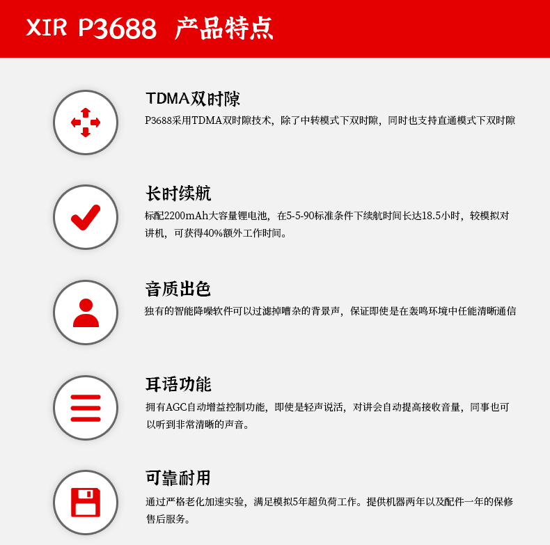 摩托羅拉Xir P3688是一款商用對講機,功率為4W。 標配2200mAh大容量鋰電池,在5-5-90條件下可續航18.5小時。 降噪軟件可以降低噪音,提高通訊性能。