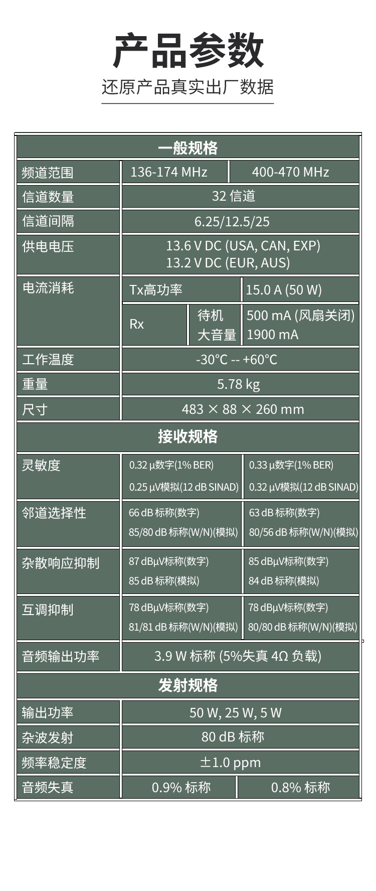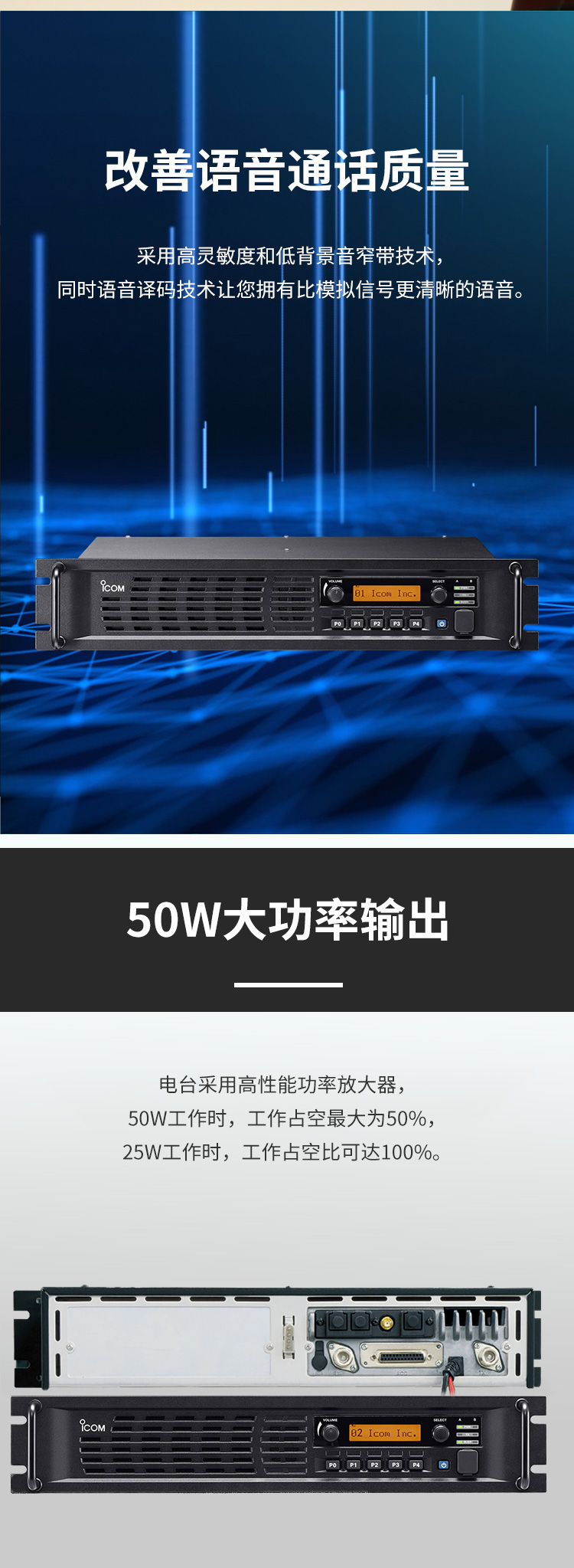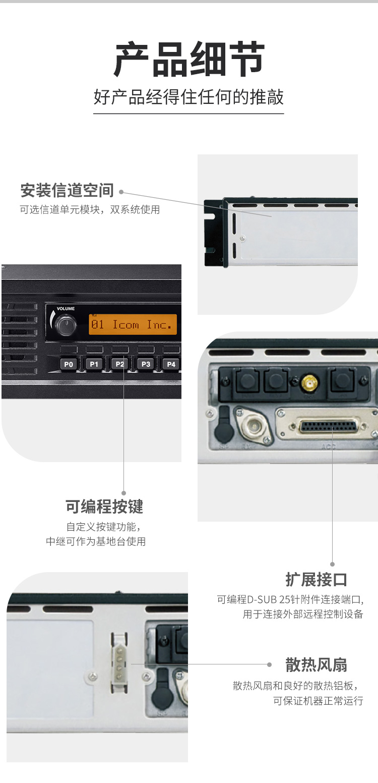一個機架,兩套系統,數模兼容式中繼臺。標準機架設計,19英寸,2U高度,32信道。50W功率輸出。