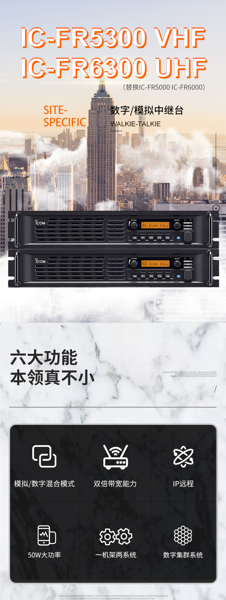 IC-FR5300/FR6300  數字/模擬中繼臺是IC-FR5000/IC-FR6000系列中繼電臺的升級產品,性能特點和之前的中繼基本相同。