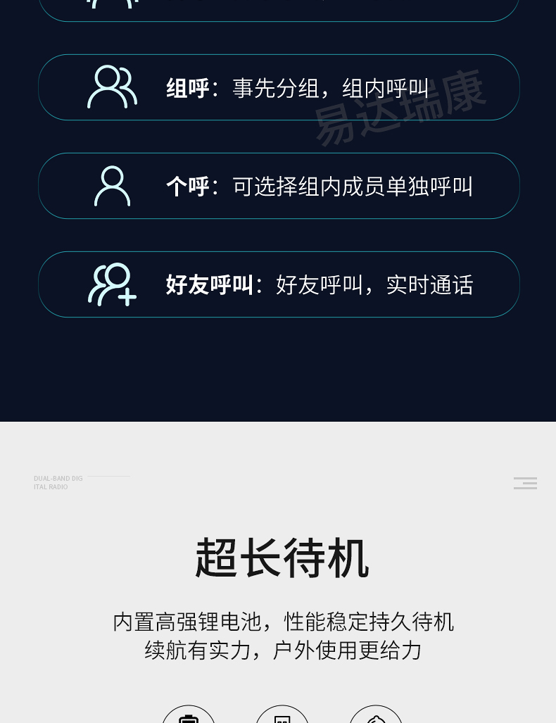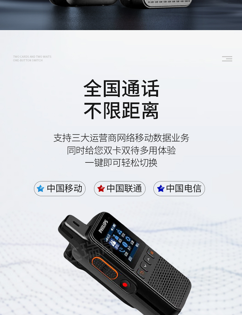 雙卡雙待 3大運(yùn)營商使用 不限距離,全國對講 隨時(shí)錄音,云端存儲 大容量電池,強(qiáng)勁待機(jī)