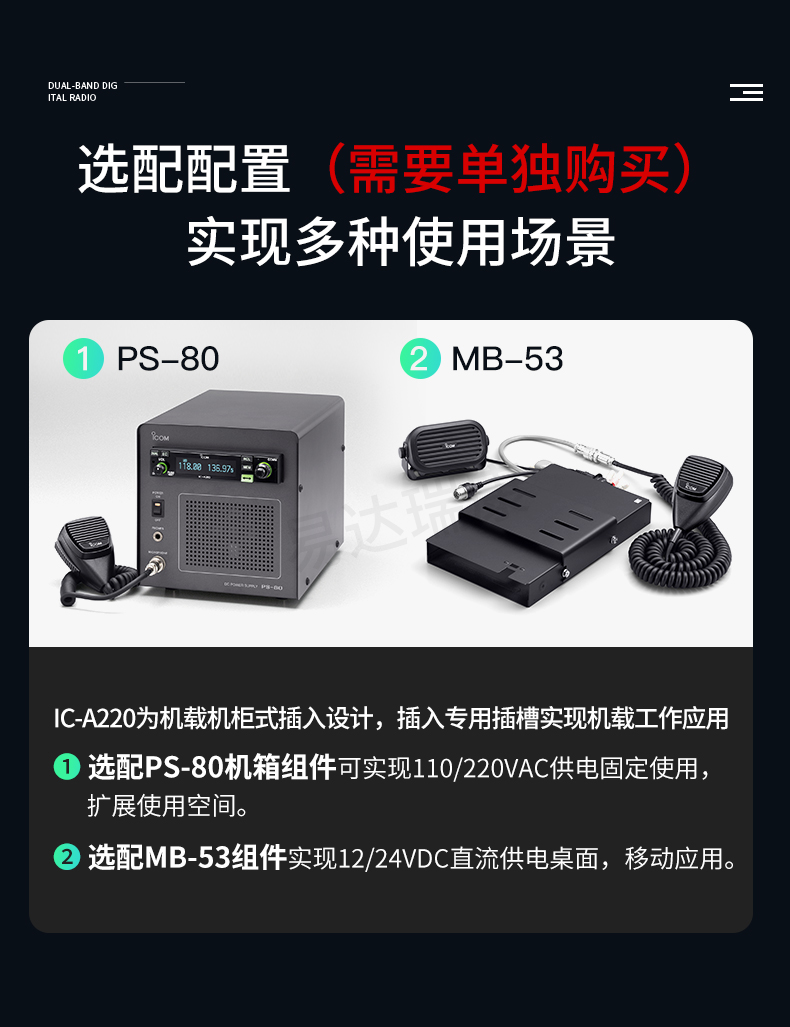 白光字符顯示,ANL自動(dòng)降噪,兼容12V/24V DC供電,遠(yuǎn)程控制。MB-53和PS-80兩種安裝方式,適用不同使用場(chǎng)所。快速回到歷史使用信道。