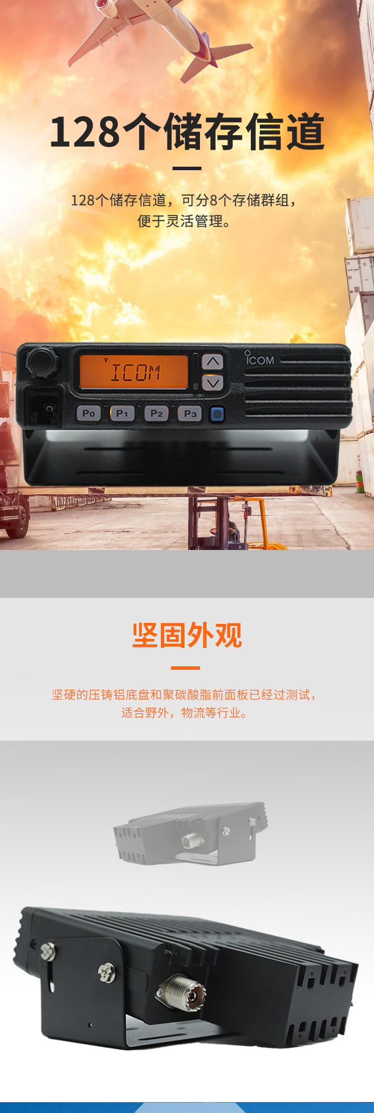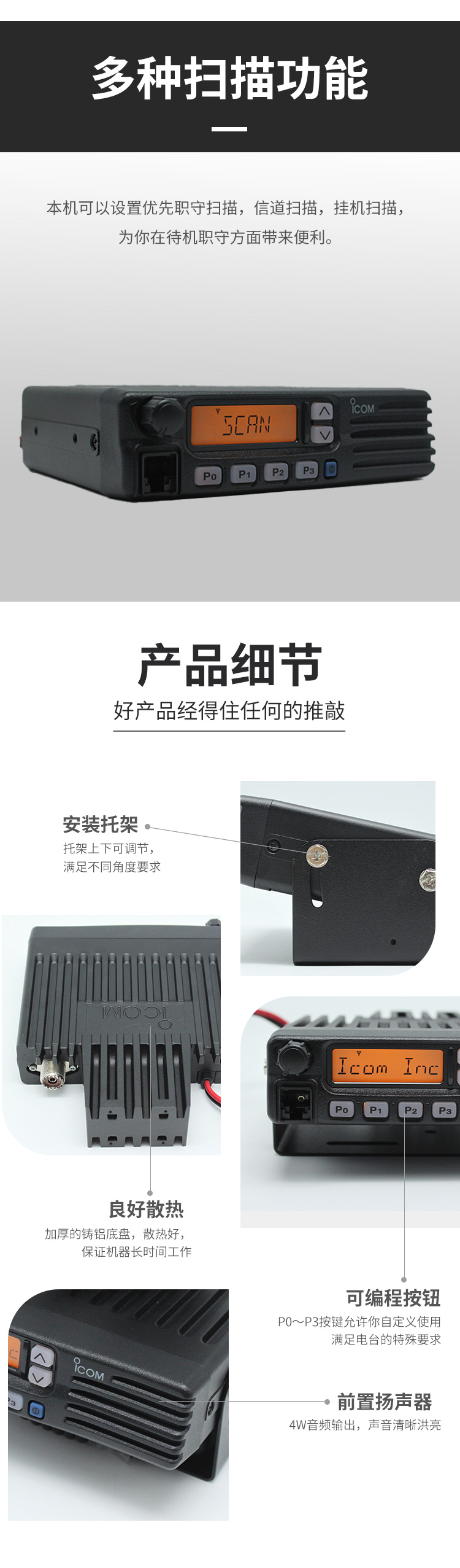 頻率范圍136-174MHz ,128個可編程信道,50W大功率輸出,多種掃描方式和普通/優先掃描,密碼開機,鑄鋁底座,有助于散熱。