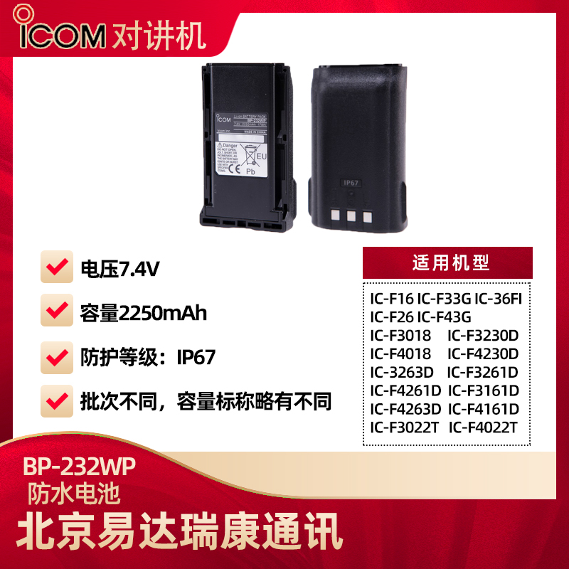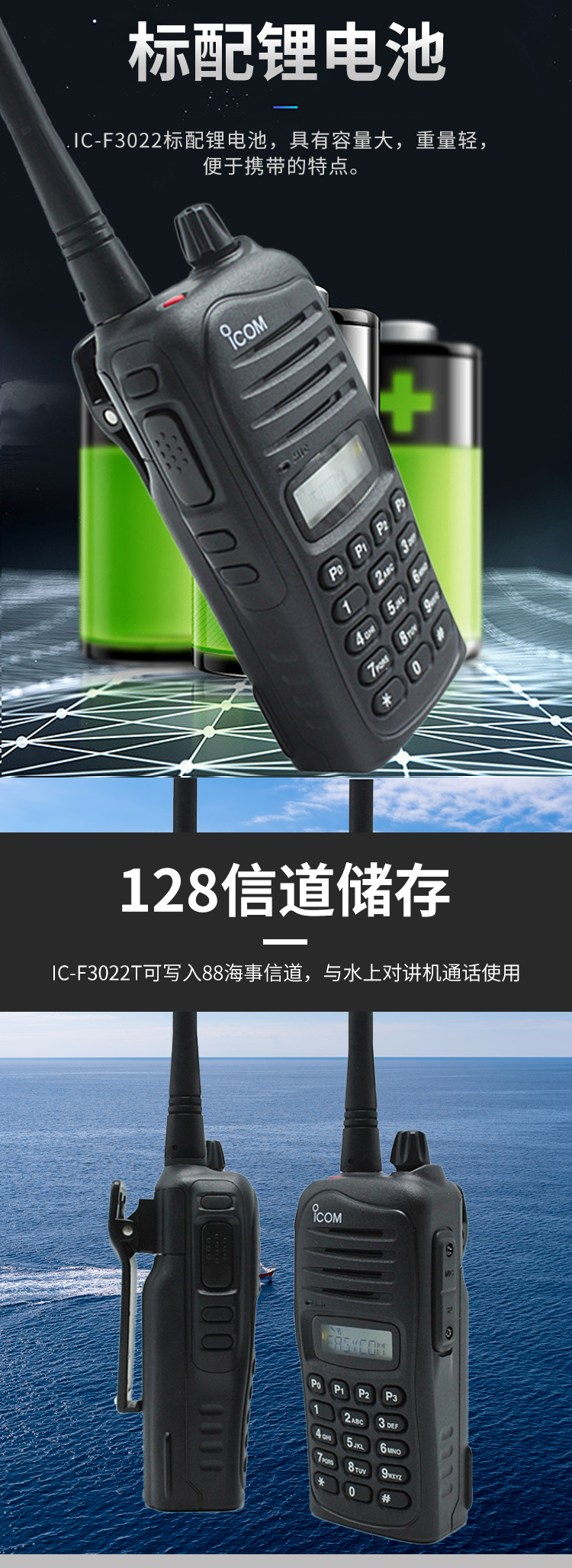 IC-F3022標(biāo)配鋰電池,具有容量大,重量輕,便于攜帶的特點(diǎn)。