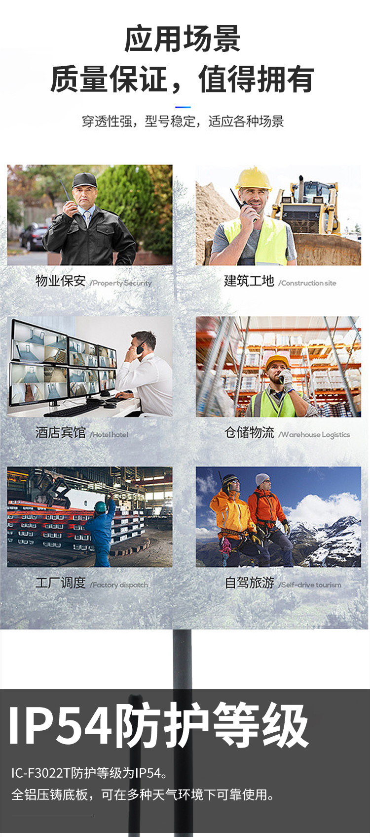 IC-F3022T通過(guò)IP54防塵,防滴濺測(cè)試。全鋁壓鑄底板,可在各種天氣環(huán)境下可靠使用。